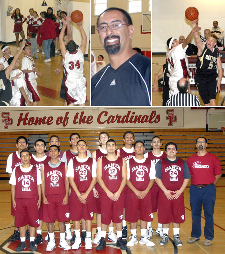 (Bottom photo) Cardinal varsity basketball team: Eddie Castillo, Cesar Correa, Juan Martinez, Jesse Valencia, Taylor Casas, Antonio Rios, Jesse Aguilar, Kameron Klein, Eduardo Jimemez, Raul Calderon, Juan Reyes, Ricardo Rico, Alex Velazquez and Eric Paredes. (Above center) Coach: David Urias. (Photo top left) Kameron KLein takes a shot. (Top right) Antonio Rios jumps for the ball. (Photos by Brian D. Wilson) |