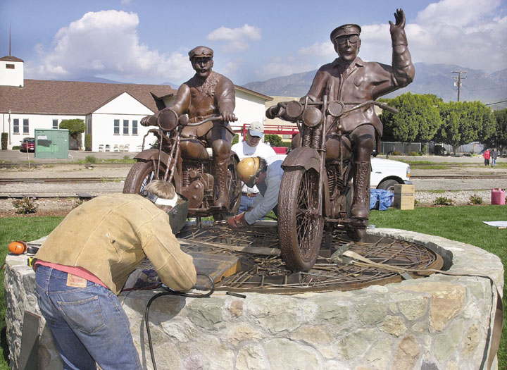 Santa Paula TimesMuch care was taken with the placement of the two motorcycle officers in forged steel, and after being hoisted into place on the cement pedestal, “The Warning” is now at home at the corner of 10th and Santa Barbara streets.“The Warning” is the first of a series of monuments to commemorate the upcoming 75th anniversary of the St. Francis Dam Disaster; the formal unveiling of Santa Paula artist Eric Richard’s statue will be held March 16th during a special commemorative event.The memorial is the culmination of years of work by the Santa Paula Historical Society and the St. Francis Dam Memorial Project to create lasting memorials to the victims and survivors of the March 12-13, 1928 dam collapse.“The Warning” already drew a crowd before it was placed at the northeast corner of Santa Barbara and 10th streets on Saturday.“I always pull over when I see a crowd of people on a corner,” said Joel Jett of Ventura. “This is awesome. . .”